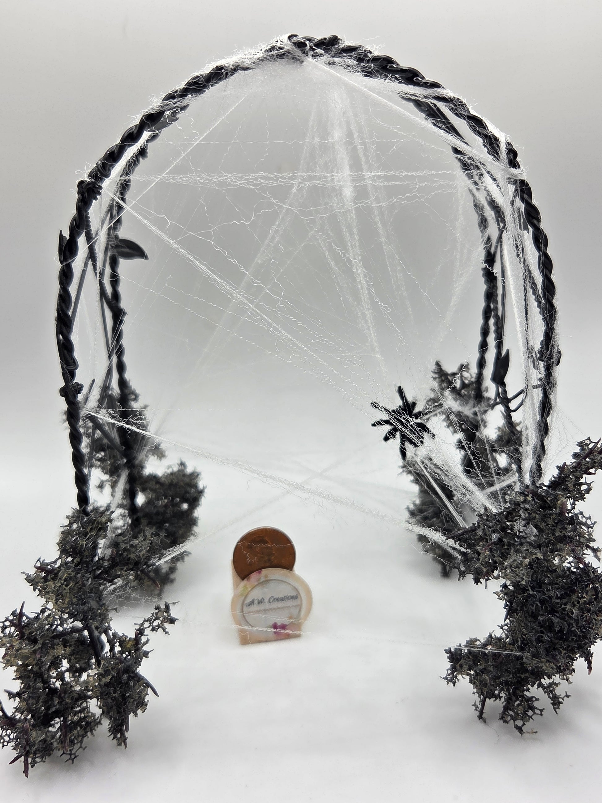 Black metal arch with cob webs and spiders.