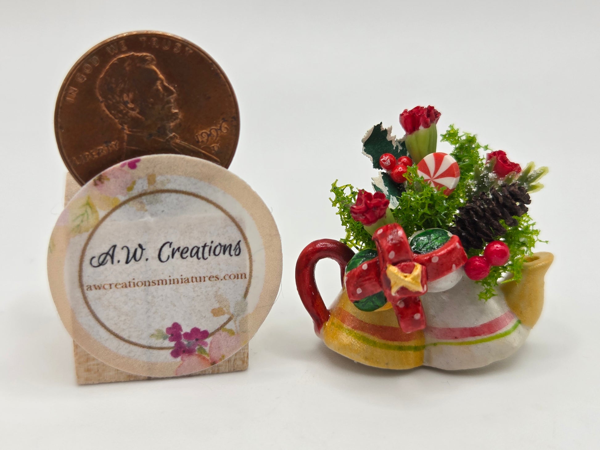 Teapot in the shape of Christmas bells filled with greens, red carnations, pinecones and peppermints