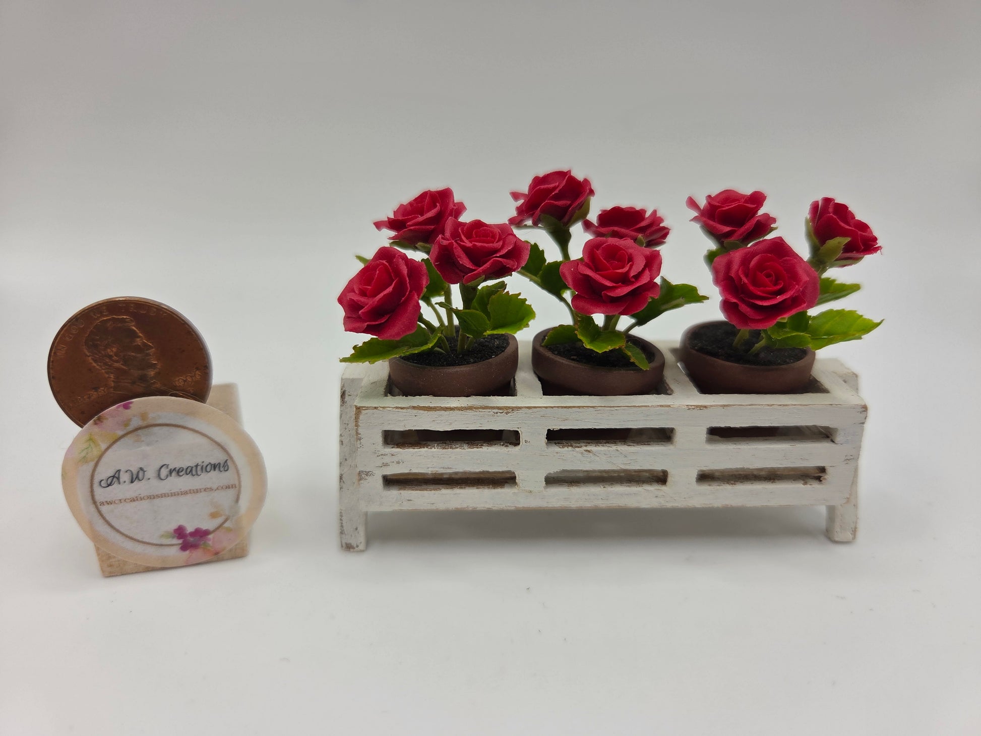 3 potted red roses (polymer clay) in a white washed wooden stand.